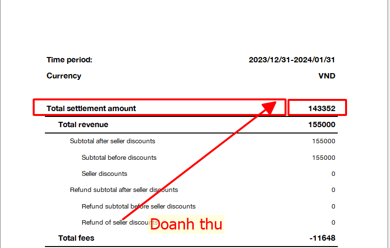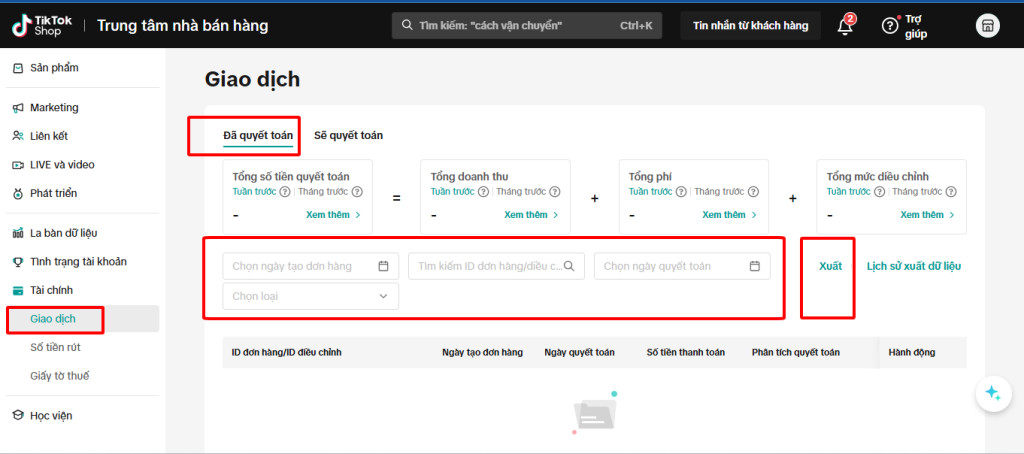 Truy cập link và tải báo cáo: https://seller-vn.tiktok.com/finance/transactions?tab=settled_tab 2. Xác định doanh thu Was this helpful? YesNo 0 / 0 #Hộ kinh doanh